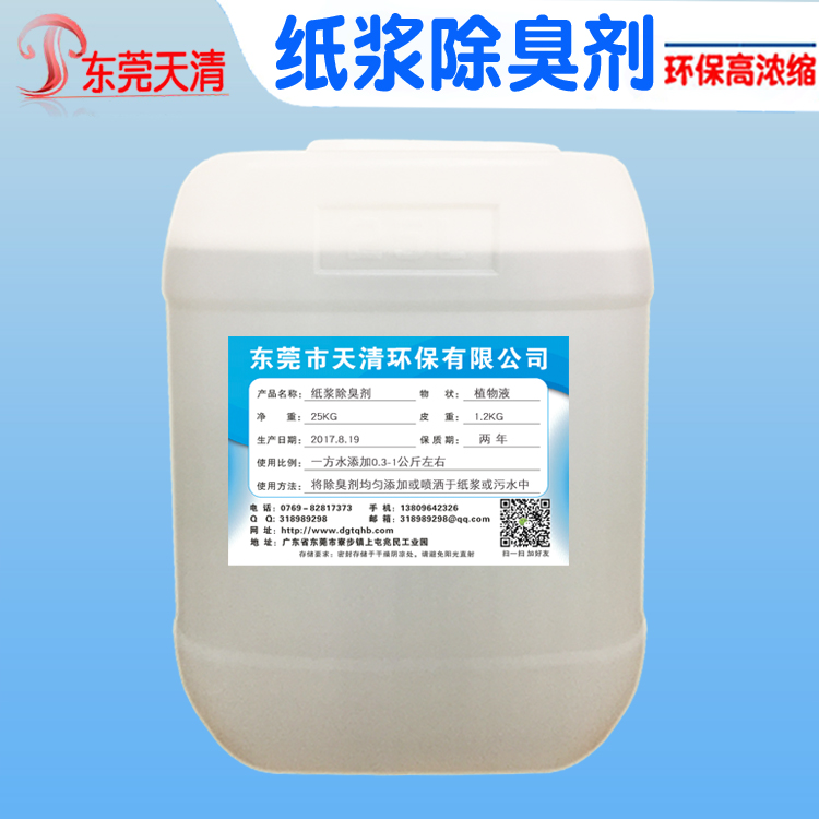 东莞市天清环保有限公司生产的纸浆除臭剂,能快速与各种有害、异味分子迅速发生聚合、取代、置换、吸附等化学反应,被吸附的恶臭分子与植物液中的酸性缓冲液发生反应,最后生成无味、无害的有机盐等。如硫化氢在植物液的作用下反应生成硫酸根离子和水;氨在植物液的作用下,生成氮气和水。