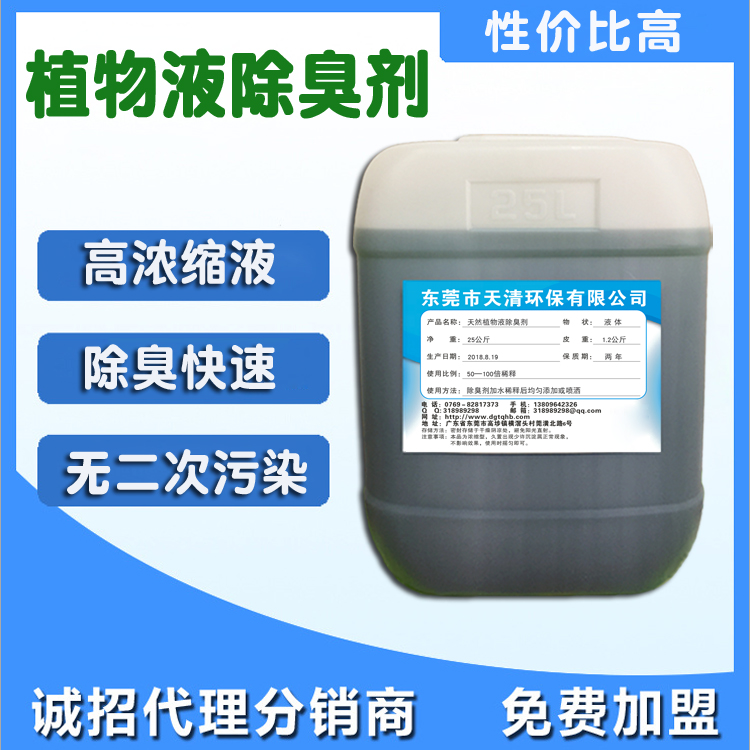 植物液除臭剂产品特点: 1、植物型垃圾除臭剂专为垃圾臭味的去除和垃圾改性抑制臭气的产生而精心研发的垃圾除臭产品,达到去除垃圾臭味和抑制垃圾臭气产生的双重效果。 2、超高浓度,可稀释20-500倍使用,除臭快速彻底。性价比高,经济实用。 3、全天然的中性产品,无毒、无可燃性、无腐蚀性、天然环保。 植物液除臭剂使用方法: 1、垃圾填埋场使用: 100-500倍稀释后,用于垃圾填埋场的直接喷洒。达到去除空气臭味和垃圾改性抑制臭味产生的效果。 2、小压站、中转站使用: 配合垃圾除臭专用设备20-50倍稀释使用,达到去除空气臭味和垃圾改性抑制臭味产生的效果。 3、垃圾房、垃圾临时堆场: 10-20倍稀释直接喷洒垃圾表面使用,达到去除空气臭味和垃圾改性抑制臭味产生的效果。 2、微生物型垃圾除臭剂 天清微生物除臭剂含有多种分解能力强的菌株,各个菌株之间存在共生关系,形成一个功能群体,有益微生物有效抑制腐败菌的分解而转向发酵分解,产生的有机酸类物质能对N、S氧化物进行降解(分解)吸收和固定。恶臭是垃圾、粪便、污水、废气等污染物中含有的乙醇、硫醇、硫醚、酚、甲酚、脂肪酸、乙醛、酮、二硫化碳、氨等物质散发出来的。这些物质恰恰可以被特定的微生物作为营养来源,微生物在摄取这些物质后,经自身的物理化学作用,将它们分解转化为无臭物质。