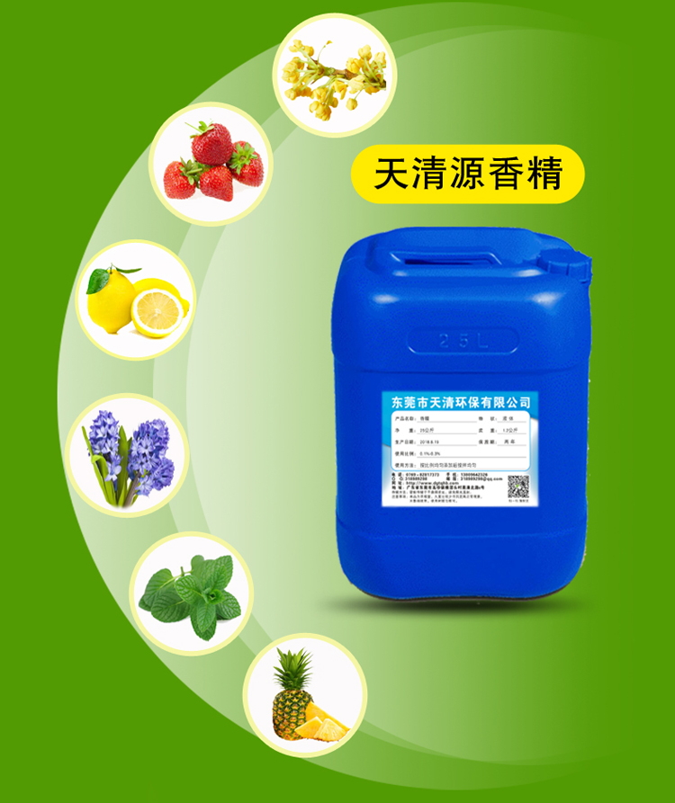 天清环保香精主要为工业生产用,具有耐温性好、香味浓、长效留香等特点。用于塑料制品、橡胶制品、硅胶、玩具、鞋材、皮革、蜡烛、化工溶剂、涂料、油漆、油墨、油品、佛香、熏香、香囊、文具用品、工艺品、纺织、纸品、海绵、产品包装内、空调出风口、宾馆房间、家庭用品、汽车内饰件及日化洗涤用品等。应用于生产塑料制品的过程中,使制品有很好的留香效果。